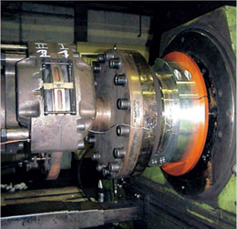 圖五展示了安裝在凸輪軸測試臺上的凸輪軸扭矩遙測系統。基于特殊應變片技術的傳感器,感受并輸出扭矩和轉角信號到發射機。傳感器和遙測發射系統均以軸端方式安裝,感應供電初級線圈(即接收天線)徑向安裝在固定件上,承擔系統供電和信號接收工作。